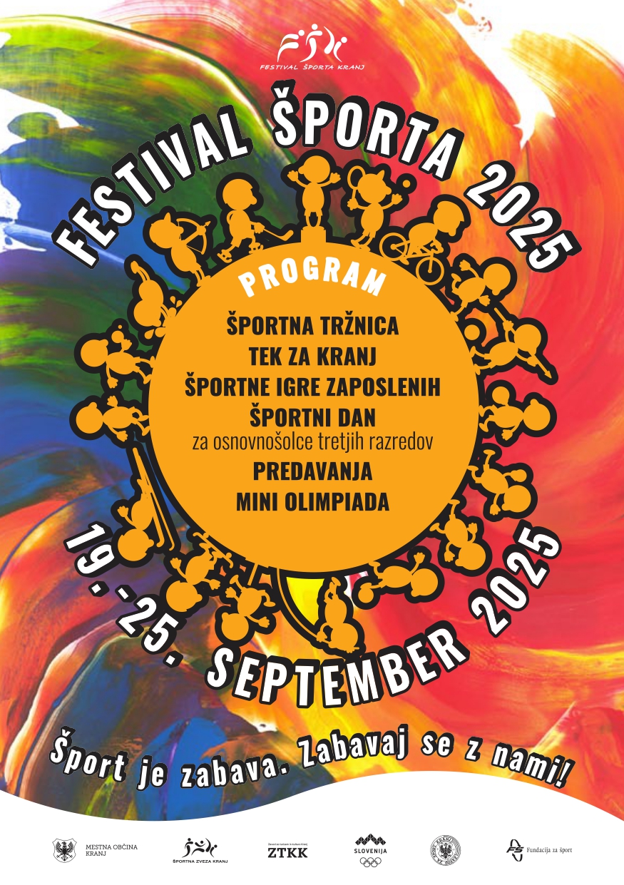 Med 19. in 25. septembrom vas vabimo na Festival športa Kranj, ki prinaša pester nabor dogodkov za vse generacije. Od teka in iger zaposlenih, do mini olimpijade in navdihujočih predavanj.